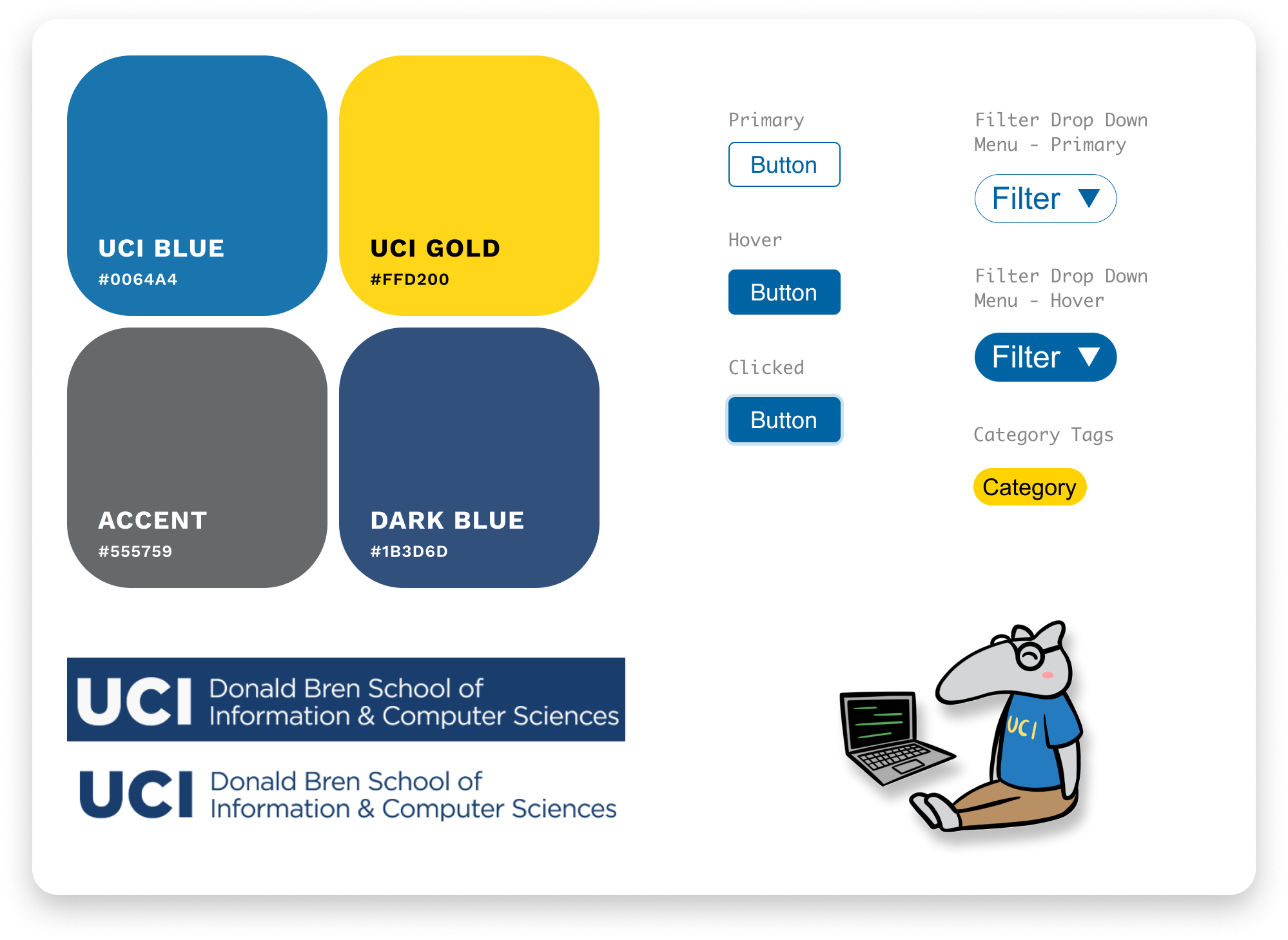 To maintain the professionalism and branding of the University of California, Irvine, we followed the UCI brand system guidelines found at https://brand.uci.edu/.